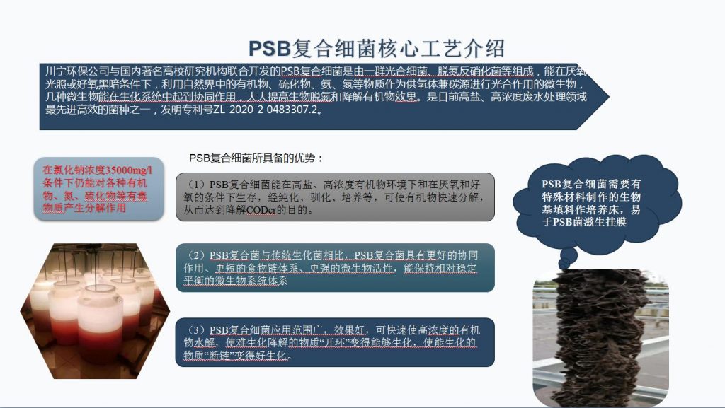川寧環(huán)保公司與國內(nèi)著名高校研究機構(gòu)聯(lián)合開發(fā)的PSB復合細菌是由一群光合細菌、脫氮反硝化菌等組成,能在厭氧光照或好氧黑暗條件下,利用自然界中的有機物、硫化物、氨、氮等物質(zhì)作為供氫體兼碳源進行光合作用的微生物,幾種微生物能在生化系統(tǒng)中起到協(xié)同作用,大大提高生物脫氮和降解有機物效果。是目前高鹽、高濃度廢水處理領(lǐng)域最先進高效的菌種之一,發(fā)明專利號ZL 2020 2 0483307.2。