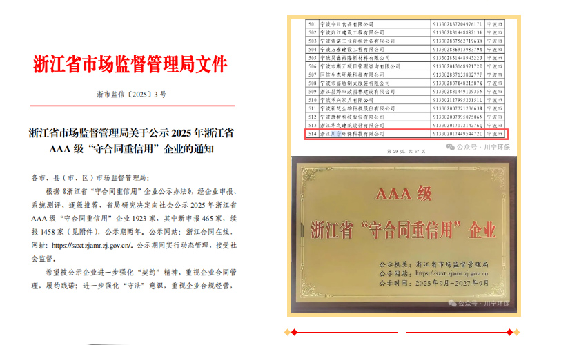 近日,浙江省市場監(jiān)督管理局發(fā)布《關于公示2025年浙江省AAA?級“守合同重信用”企業(yè)的通知》(浙市監(jiān)信〔2025〕3號),浙江川寧環(huán)??萍加邢薰驹俅纬晒θ脒x。公司自2019年7月首次斬獲浙江省守合同重信用AAA級企業(yè),2021年8月成功續(xù)評該稱號,此次2025?年再度入選。